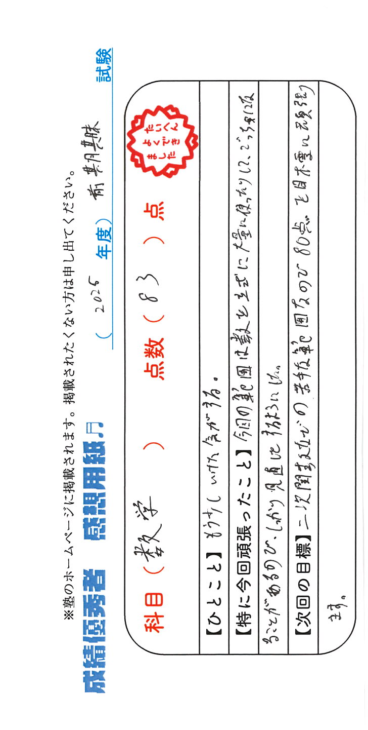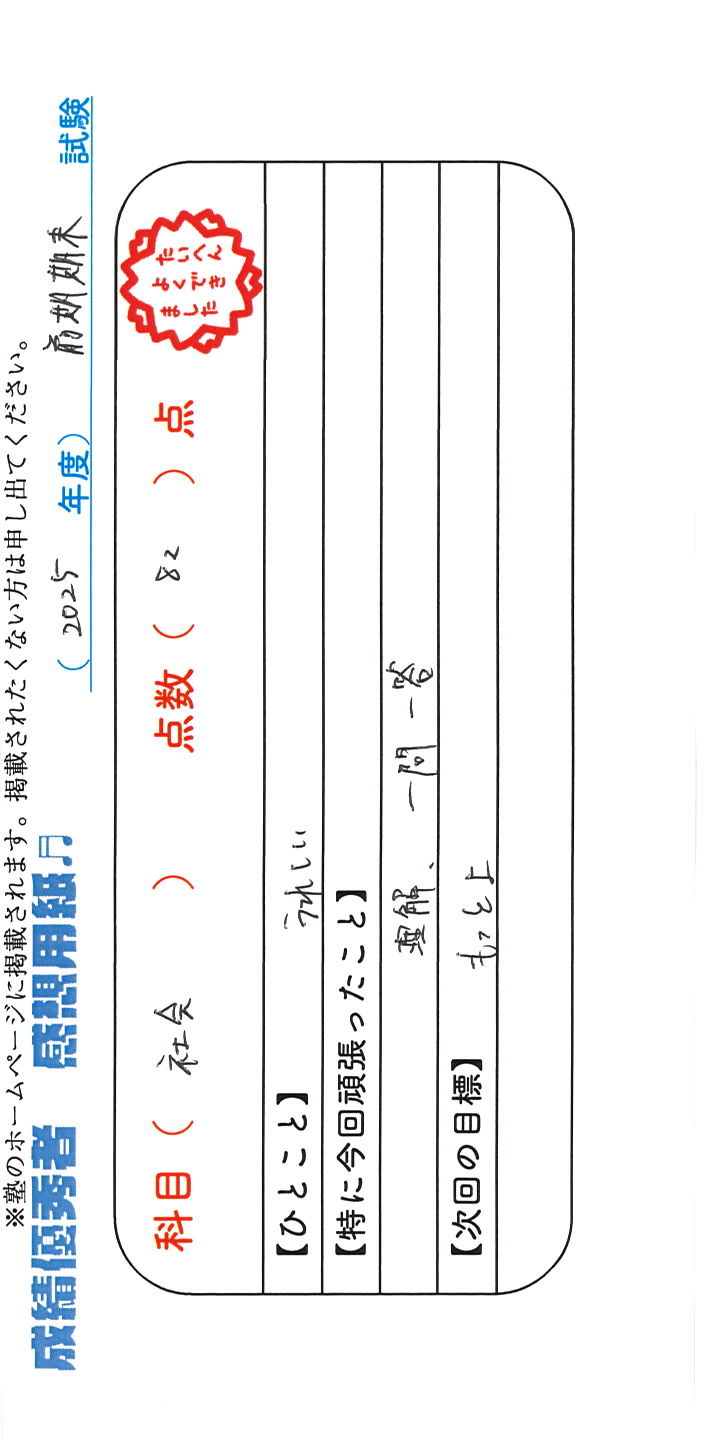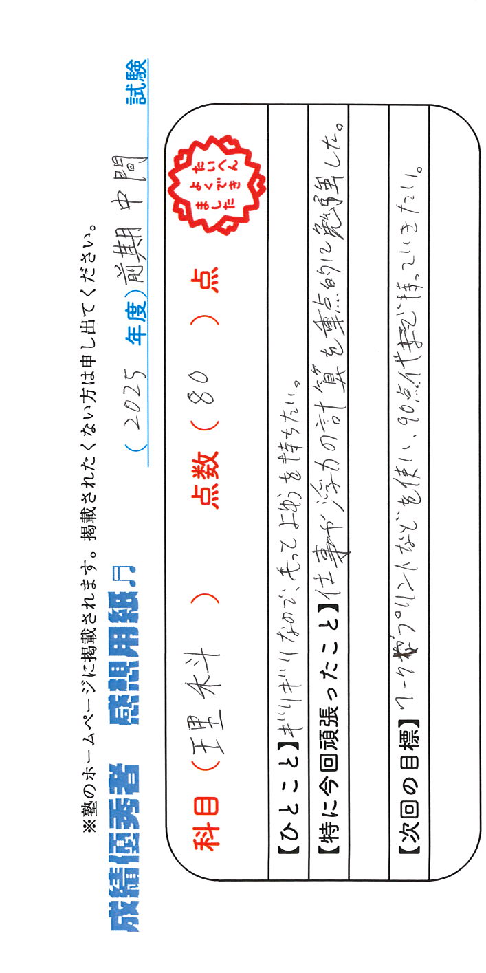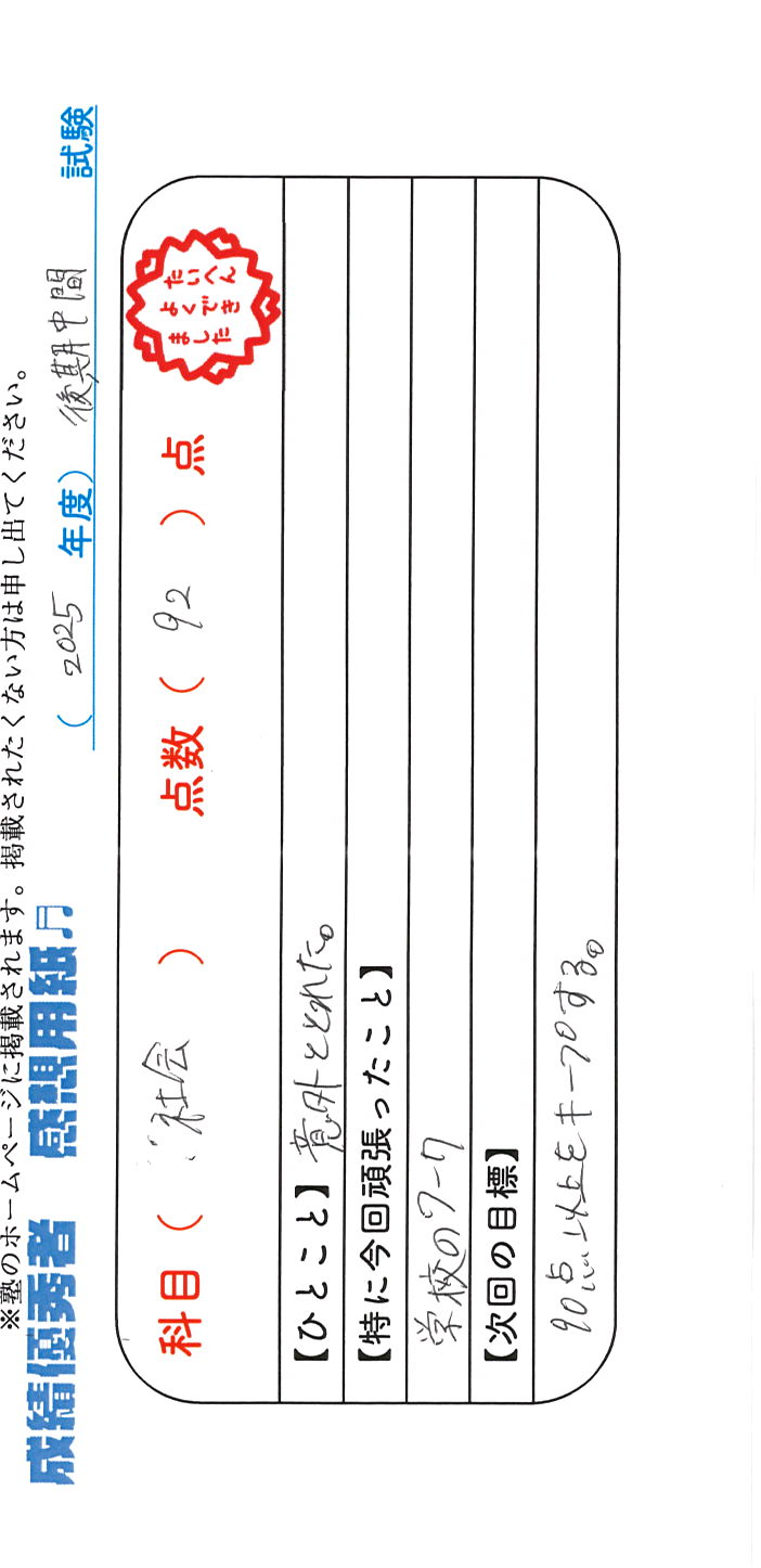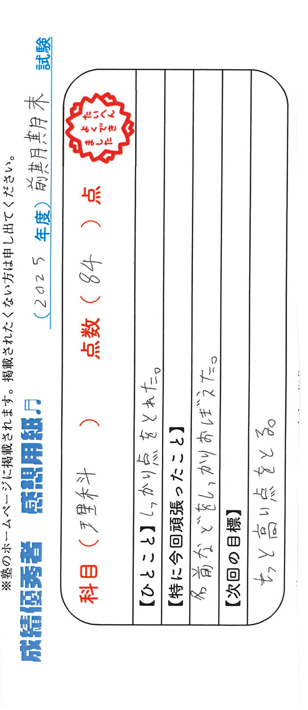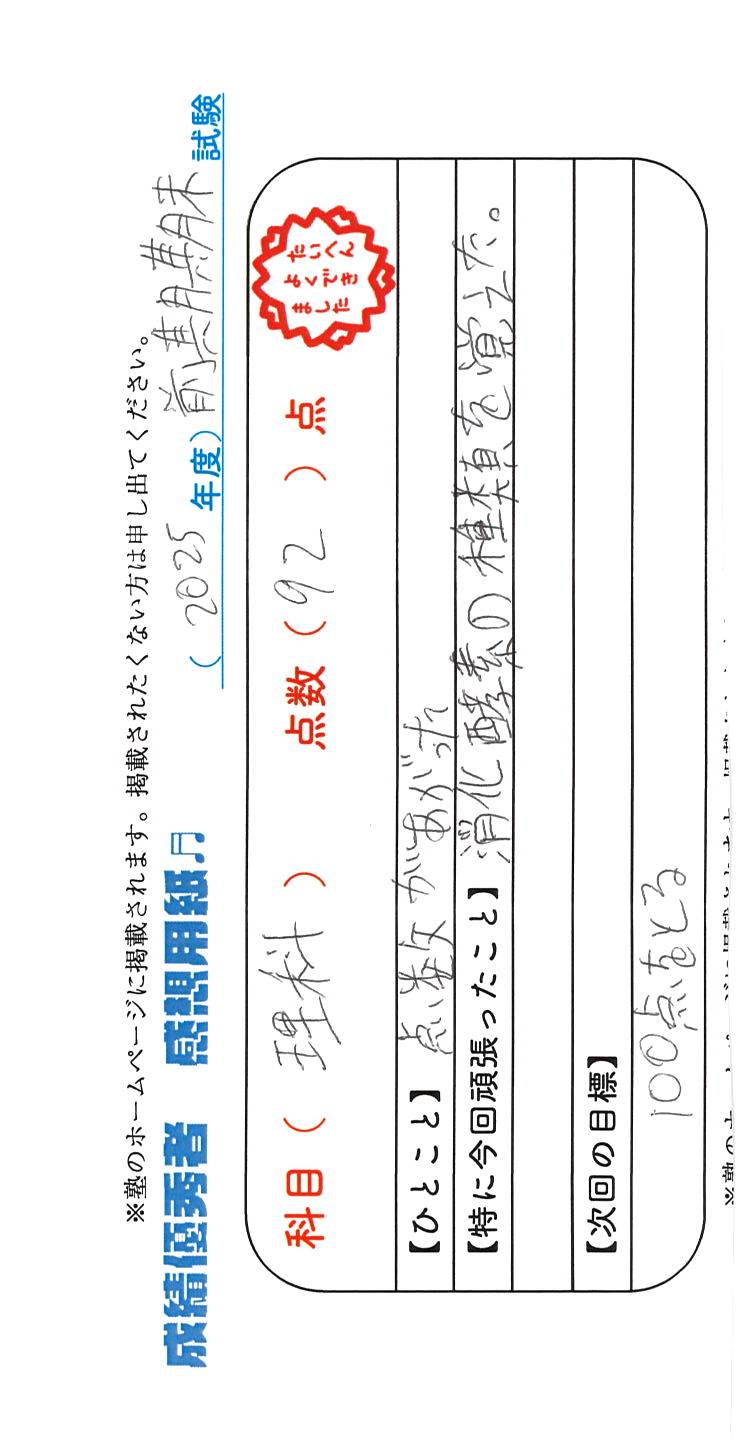 定期試験で優秀な成績を取った生徒さんのメッセージです。