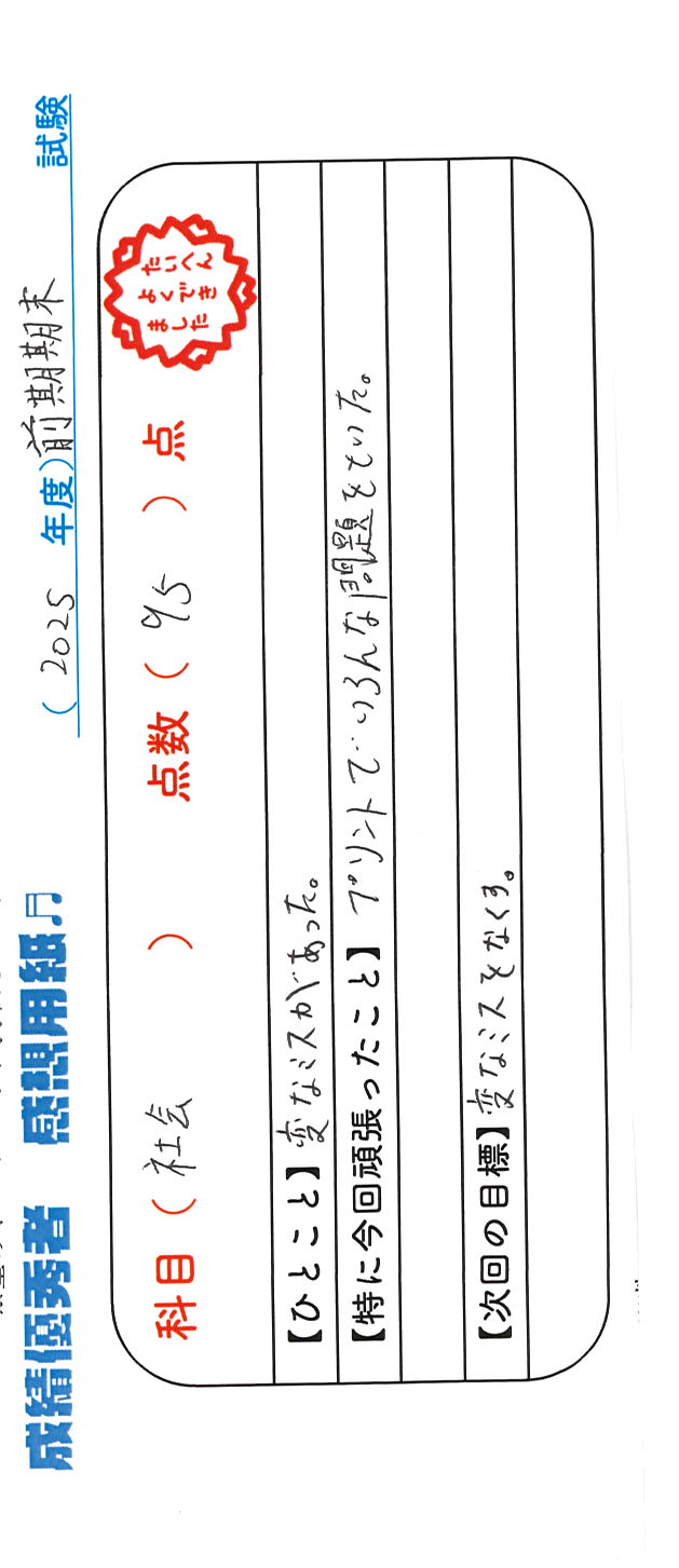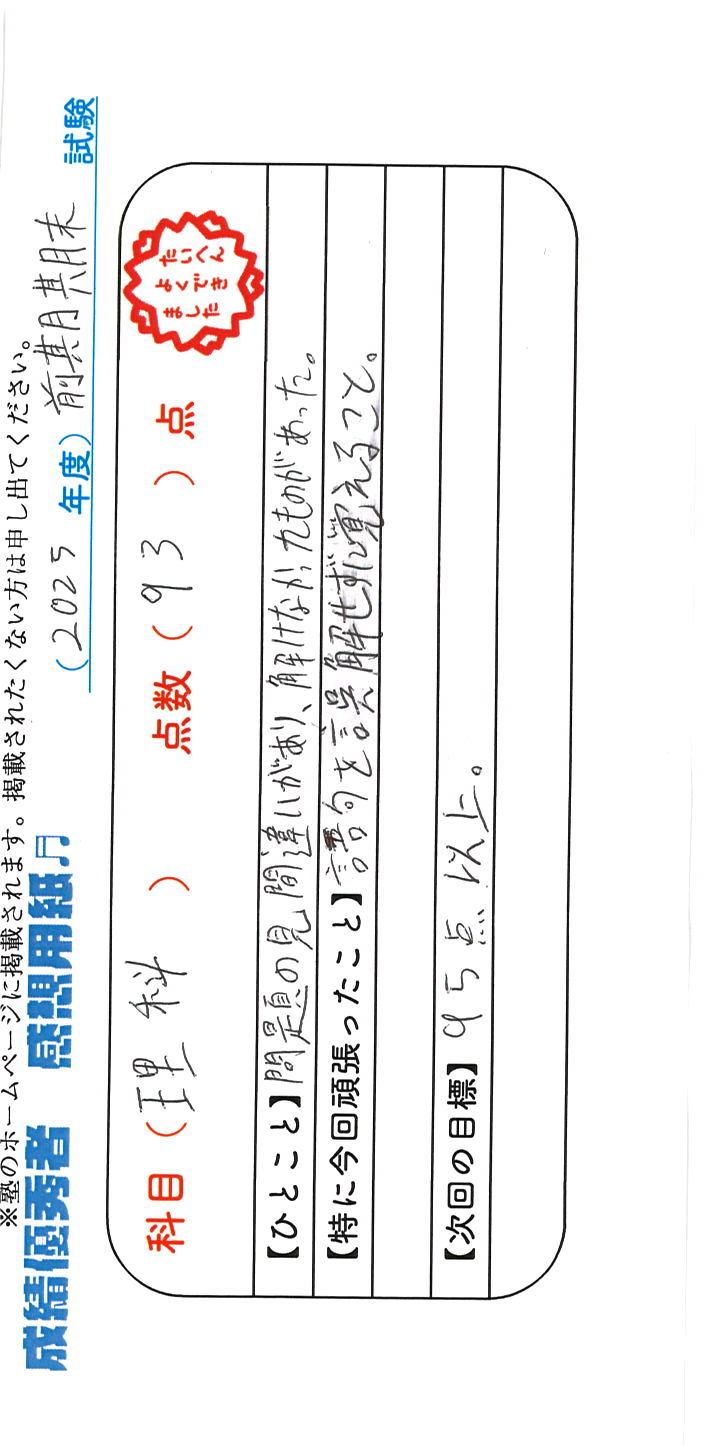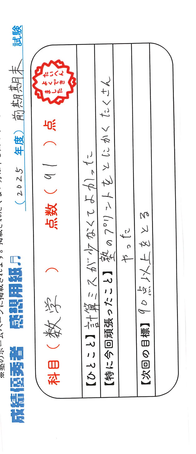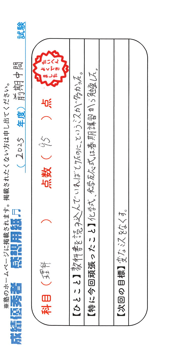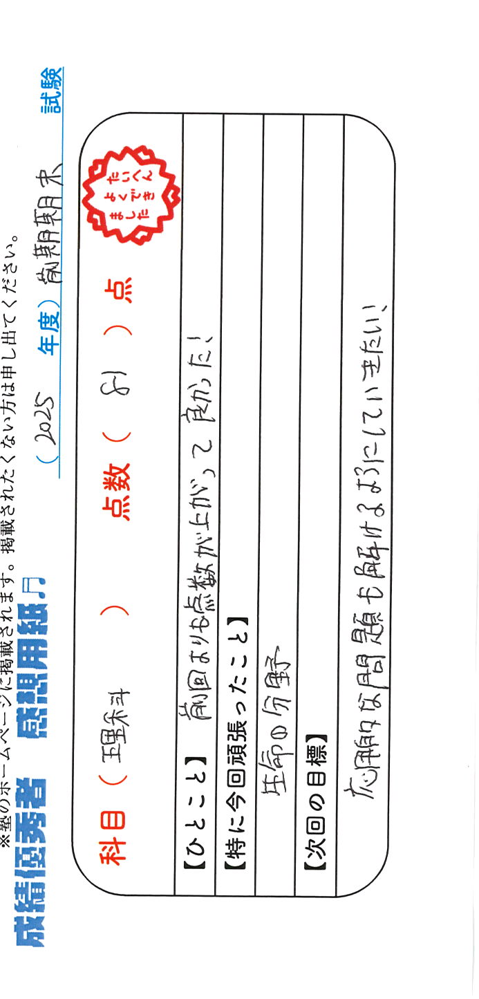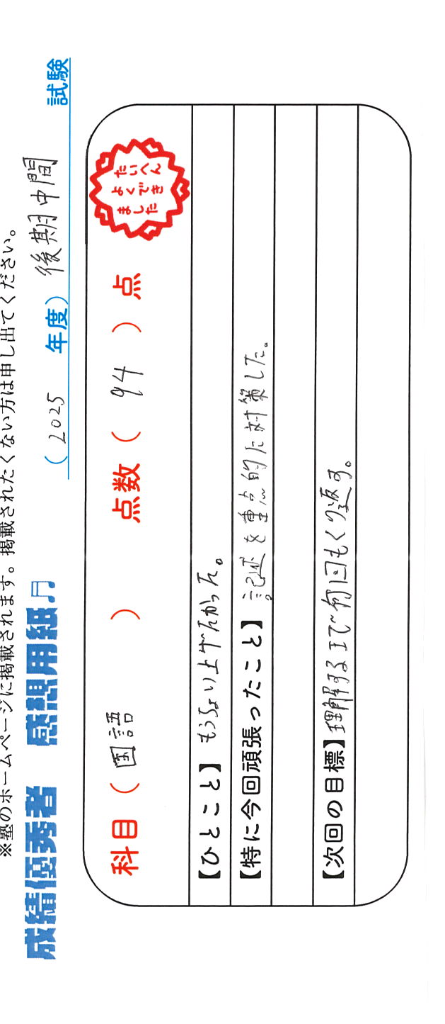 定期試験で優秀な成績を取った生徒さんのメッセージです。