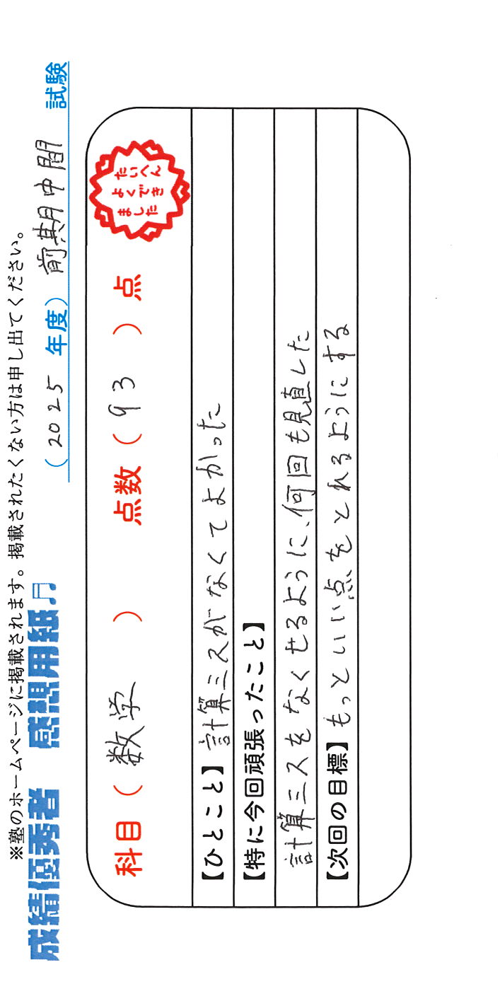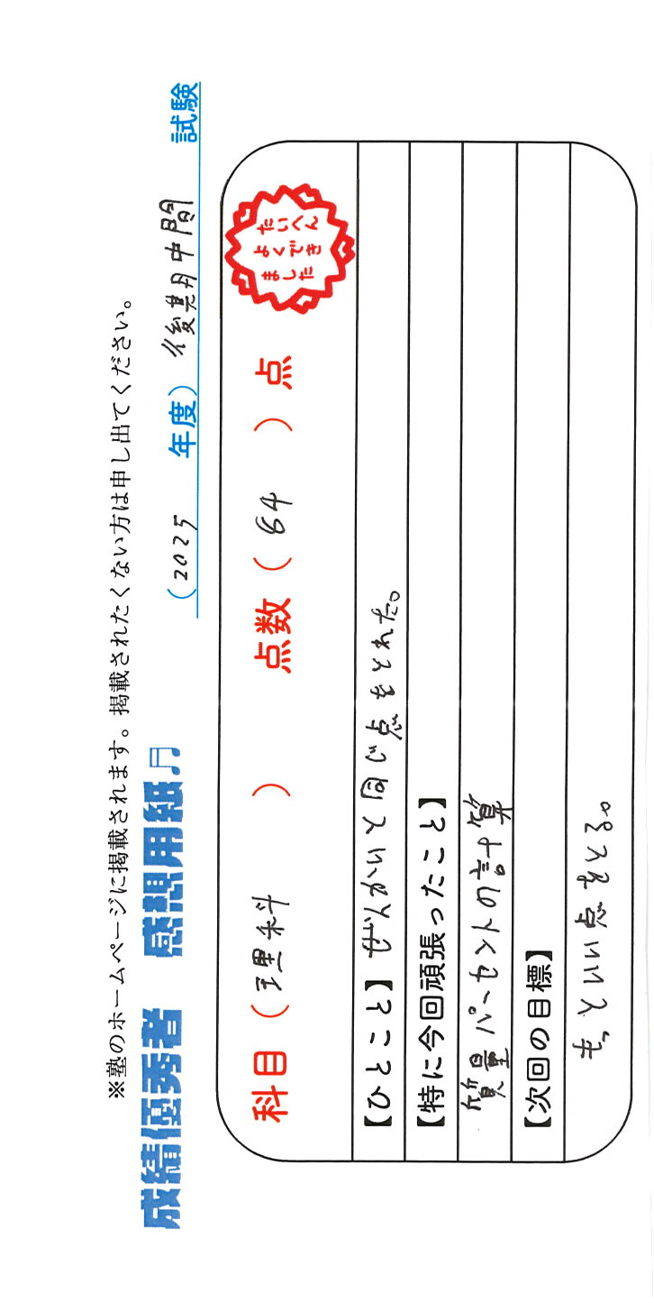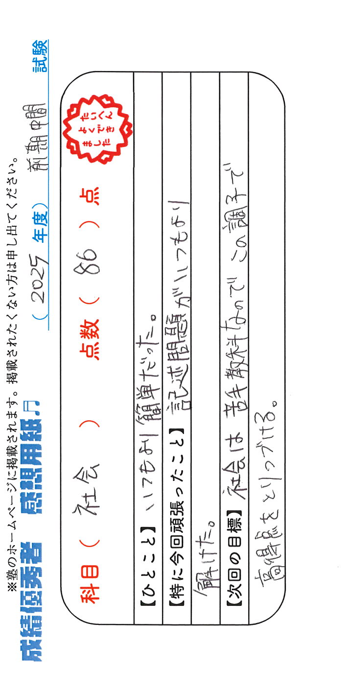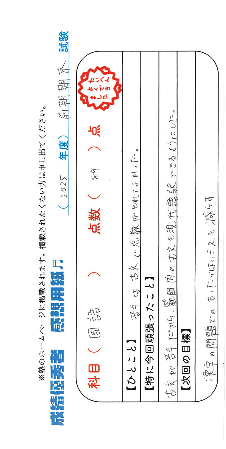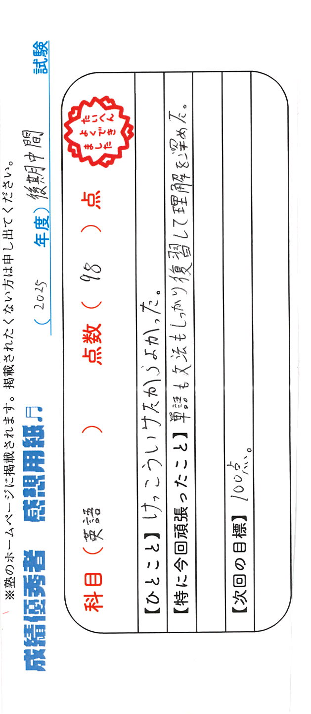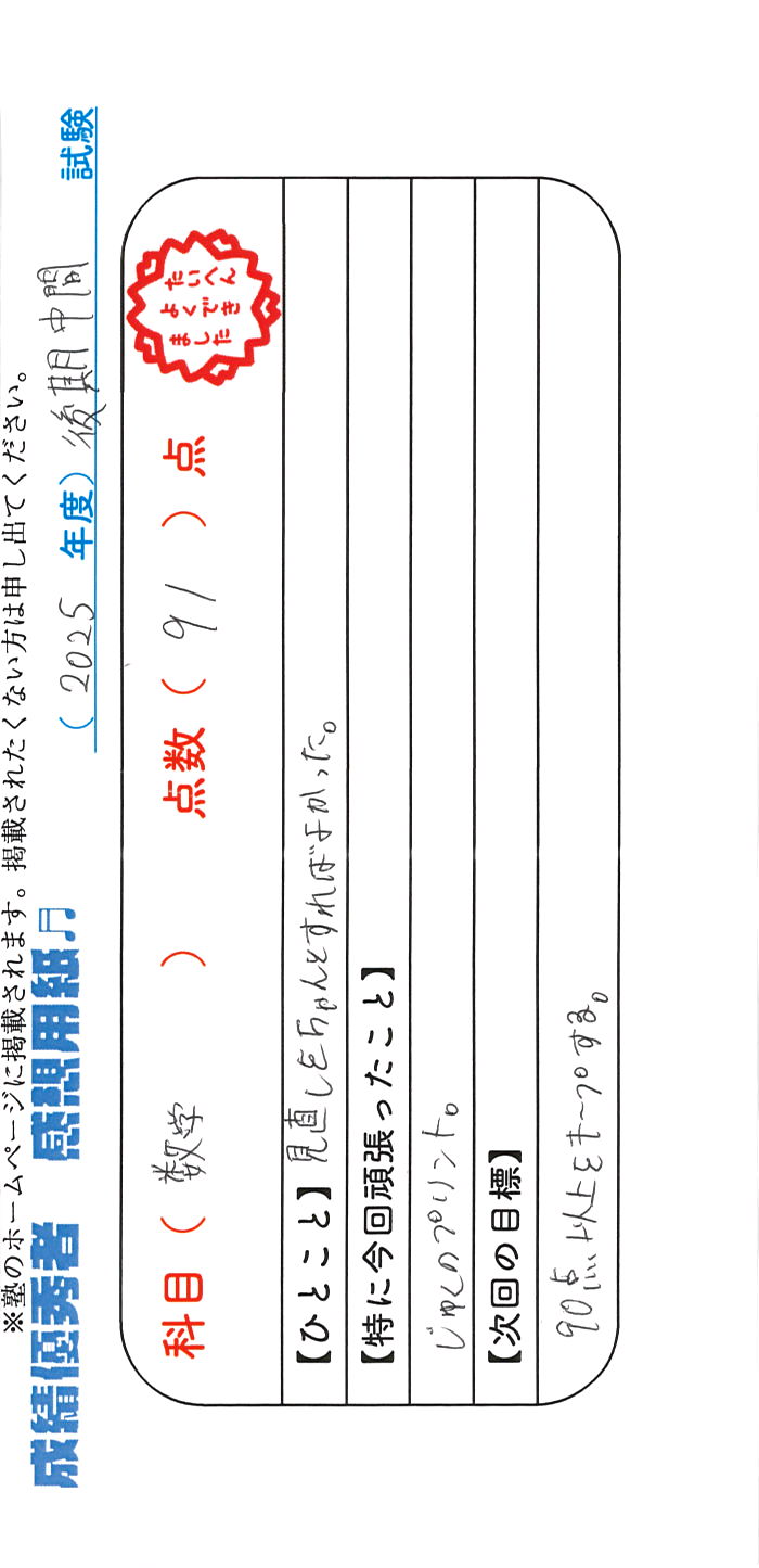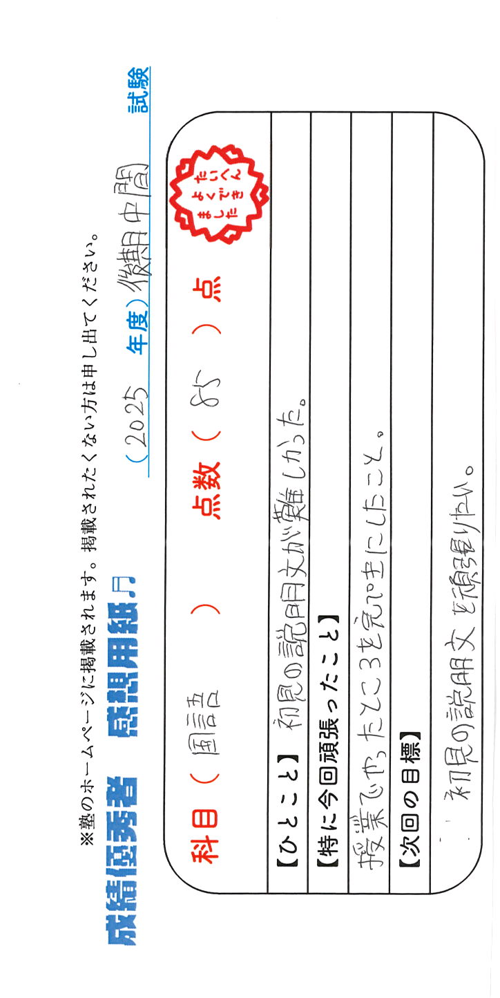 定期試験で優秀な成績を取った生徒さんのメッセージです。