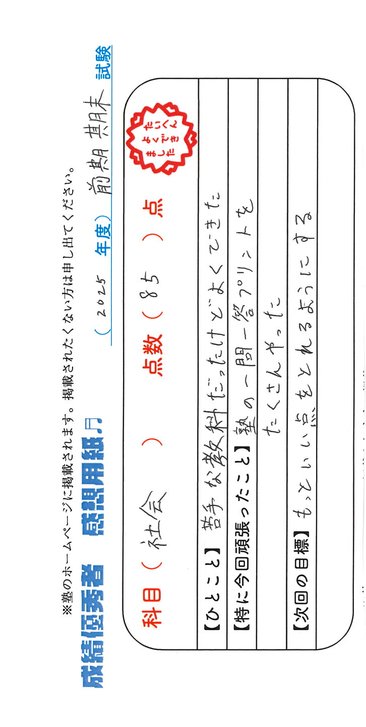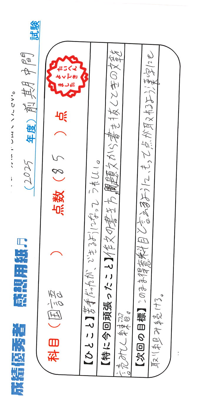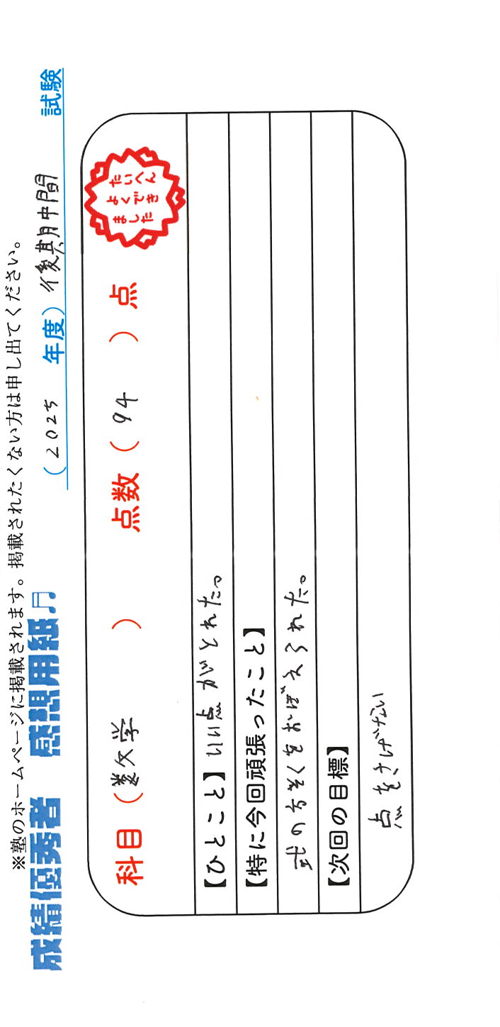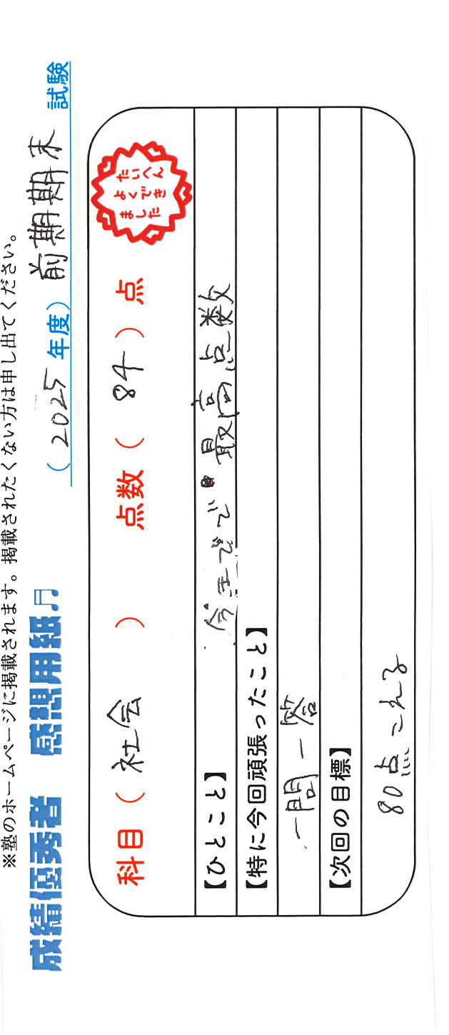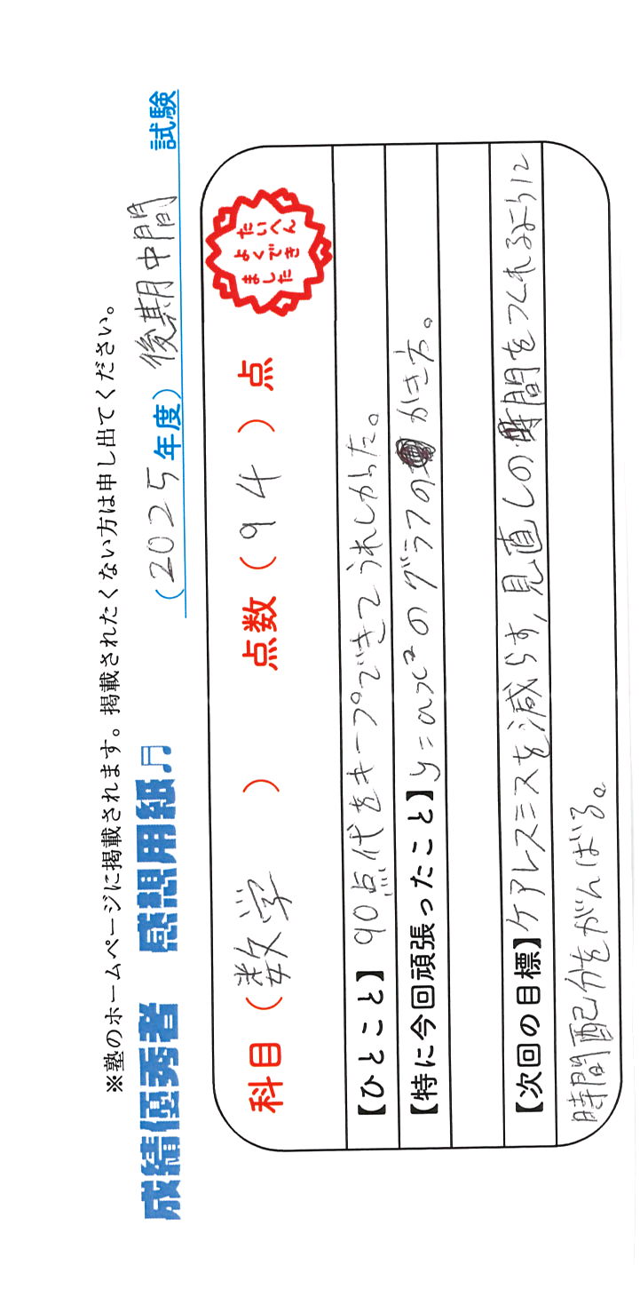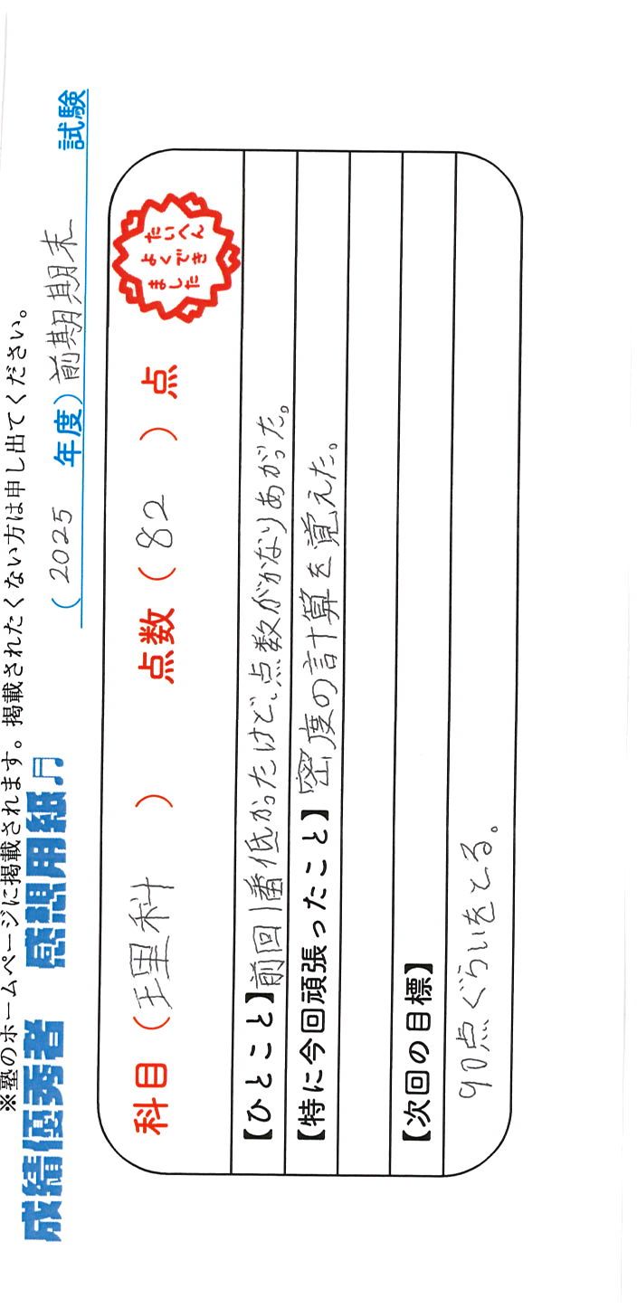 定期試験で優秀な成績を取った生徒さんのメッセージです。