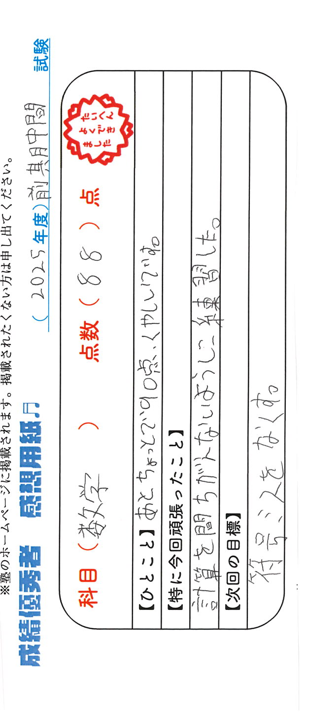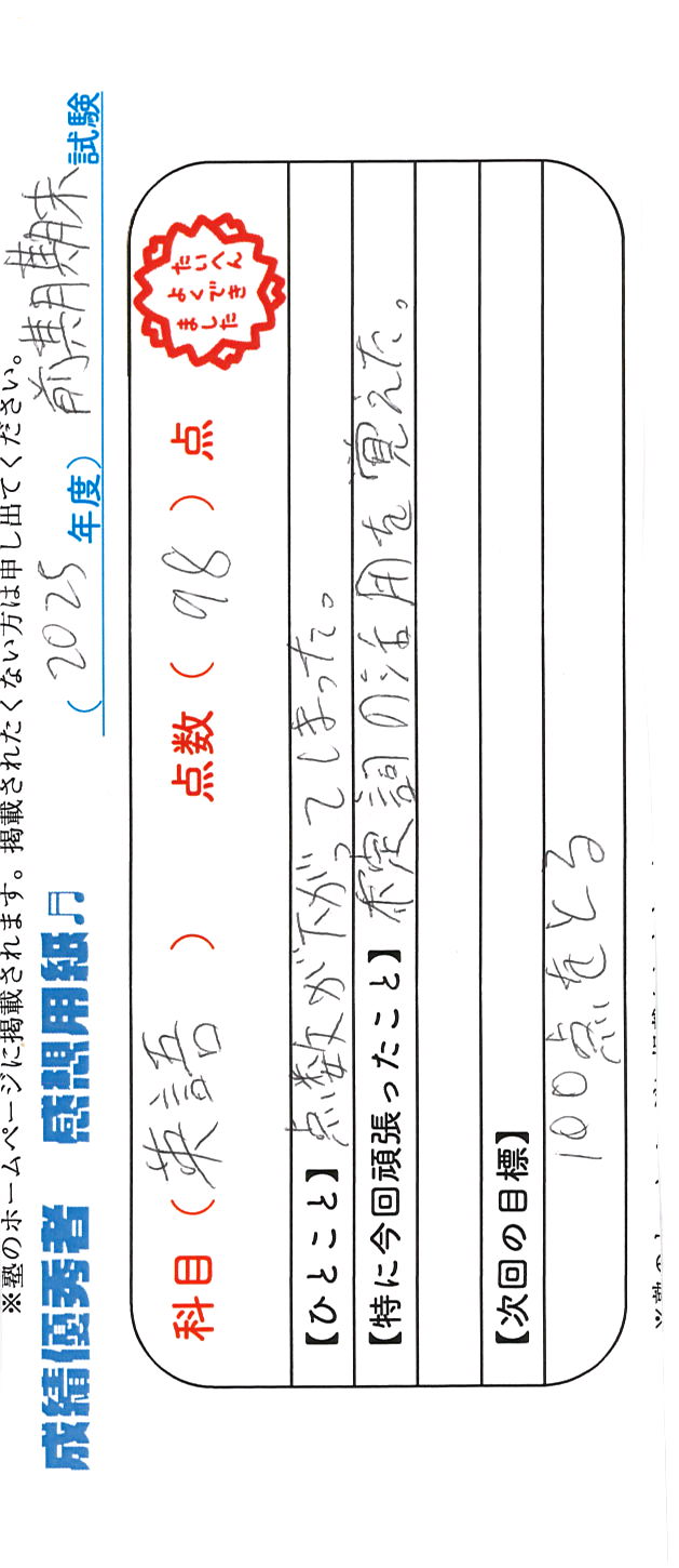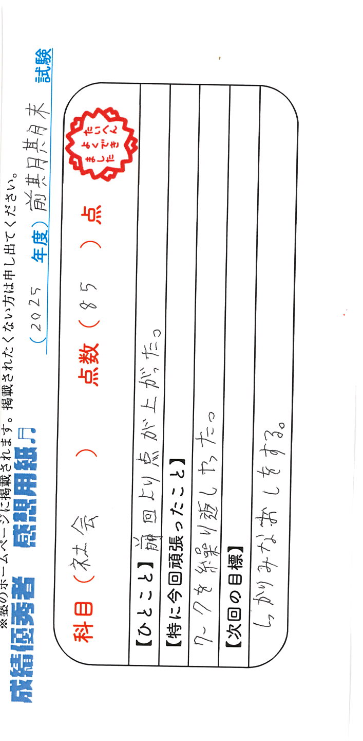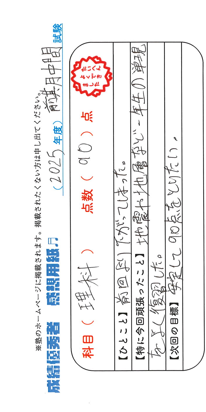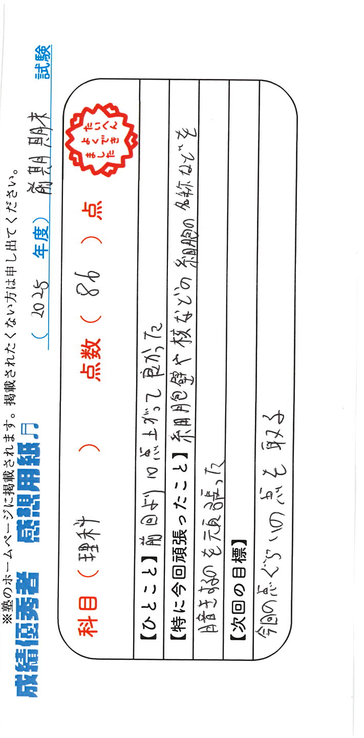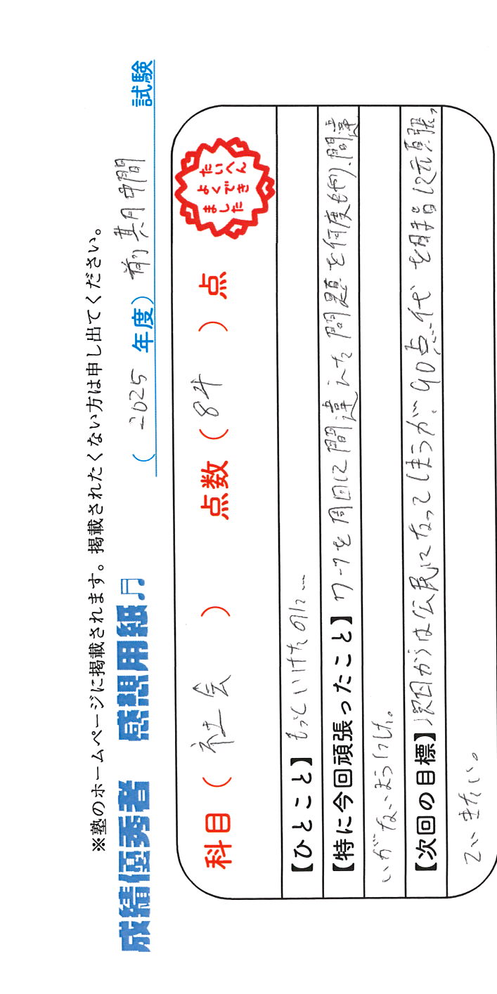 定期試験で優秀な成績を取った生徒さんのメッセージです。
