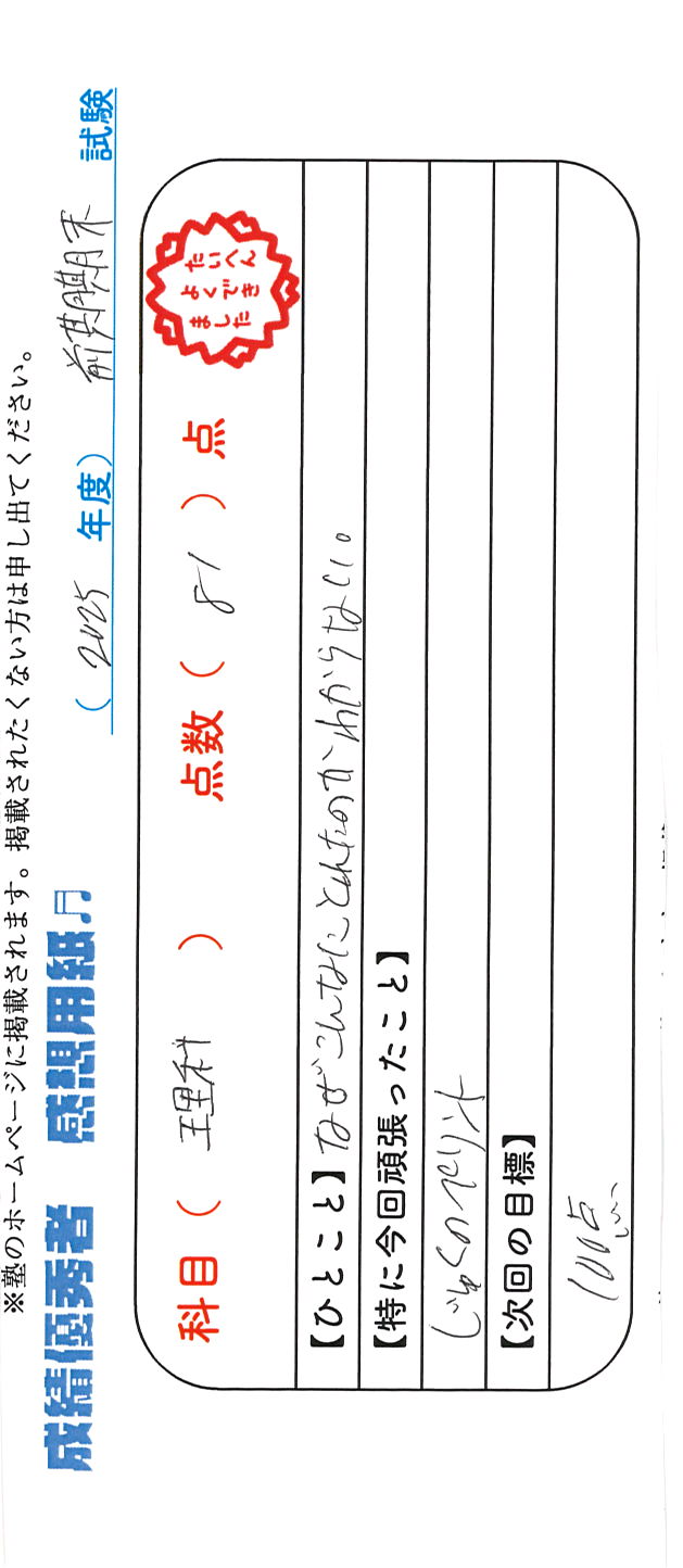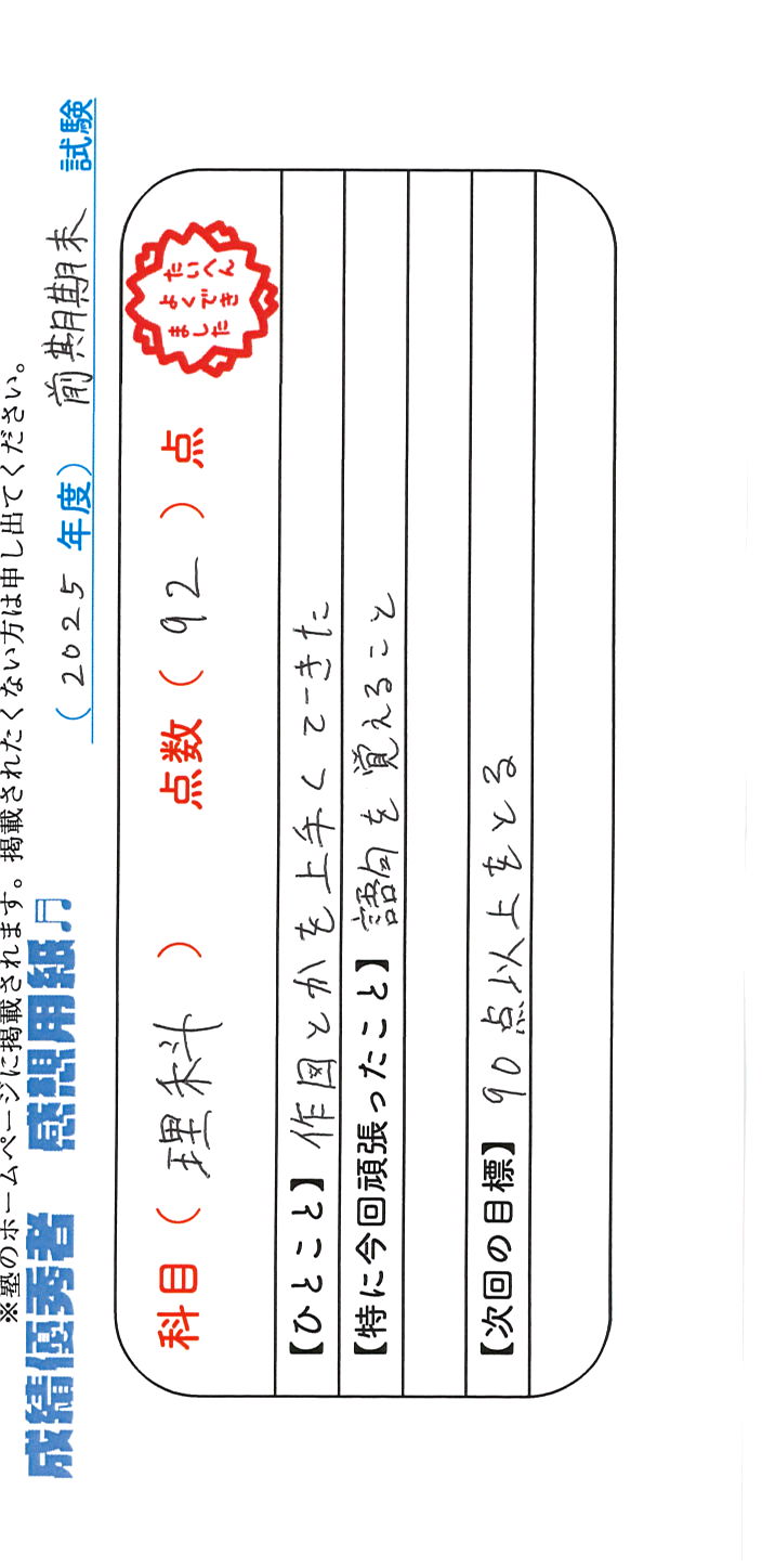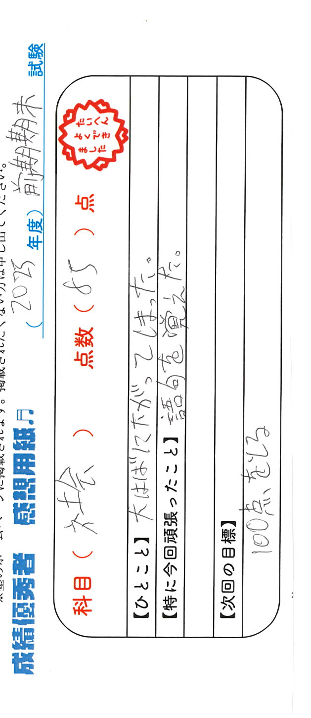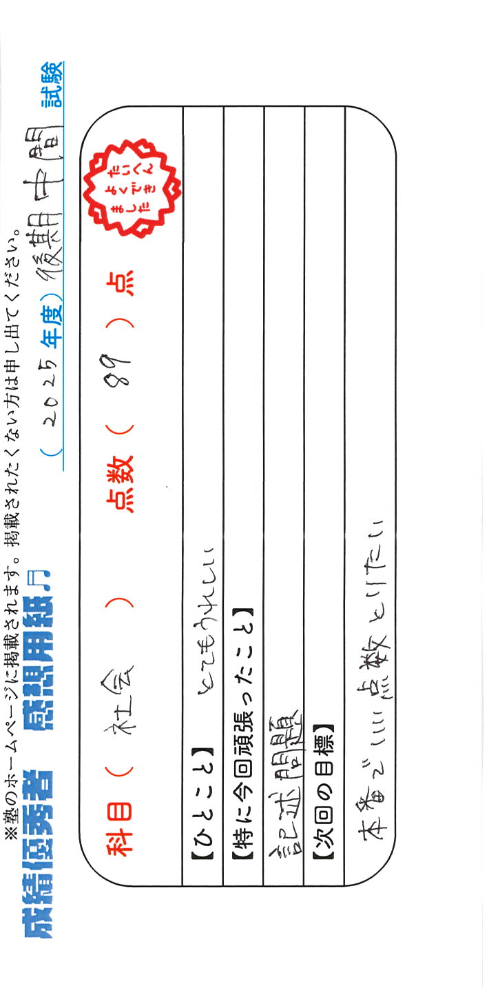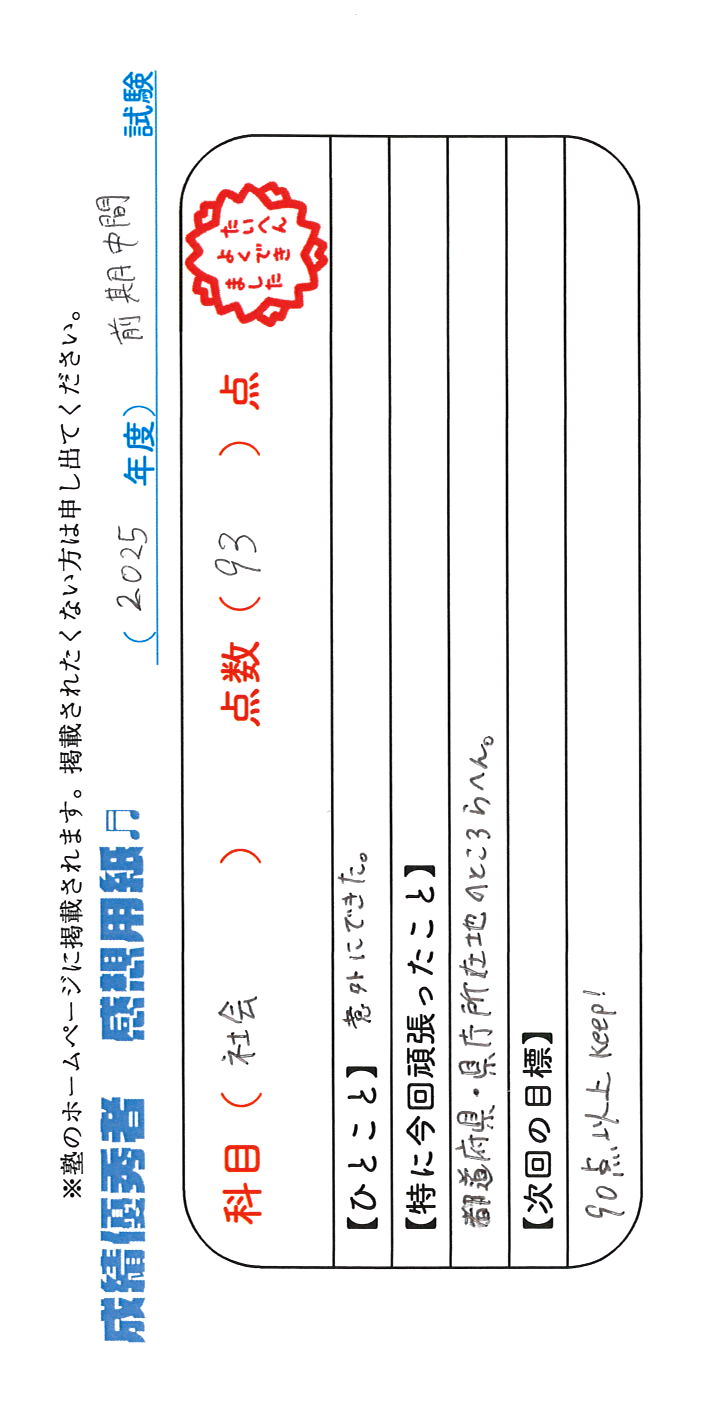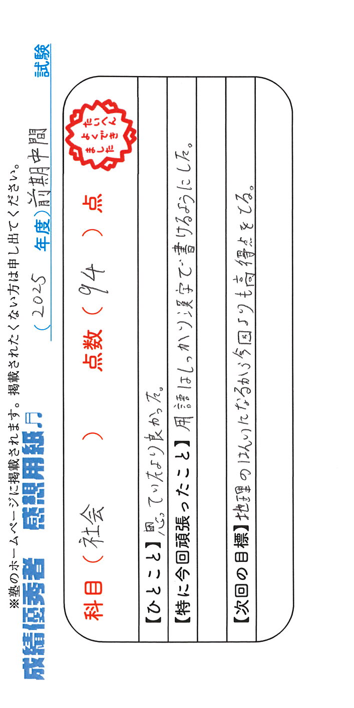 定期試験で優秀な成績を取った生徒さんのメッセージです。