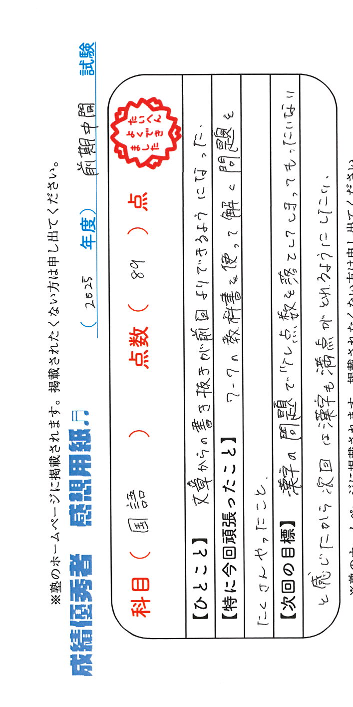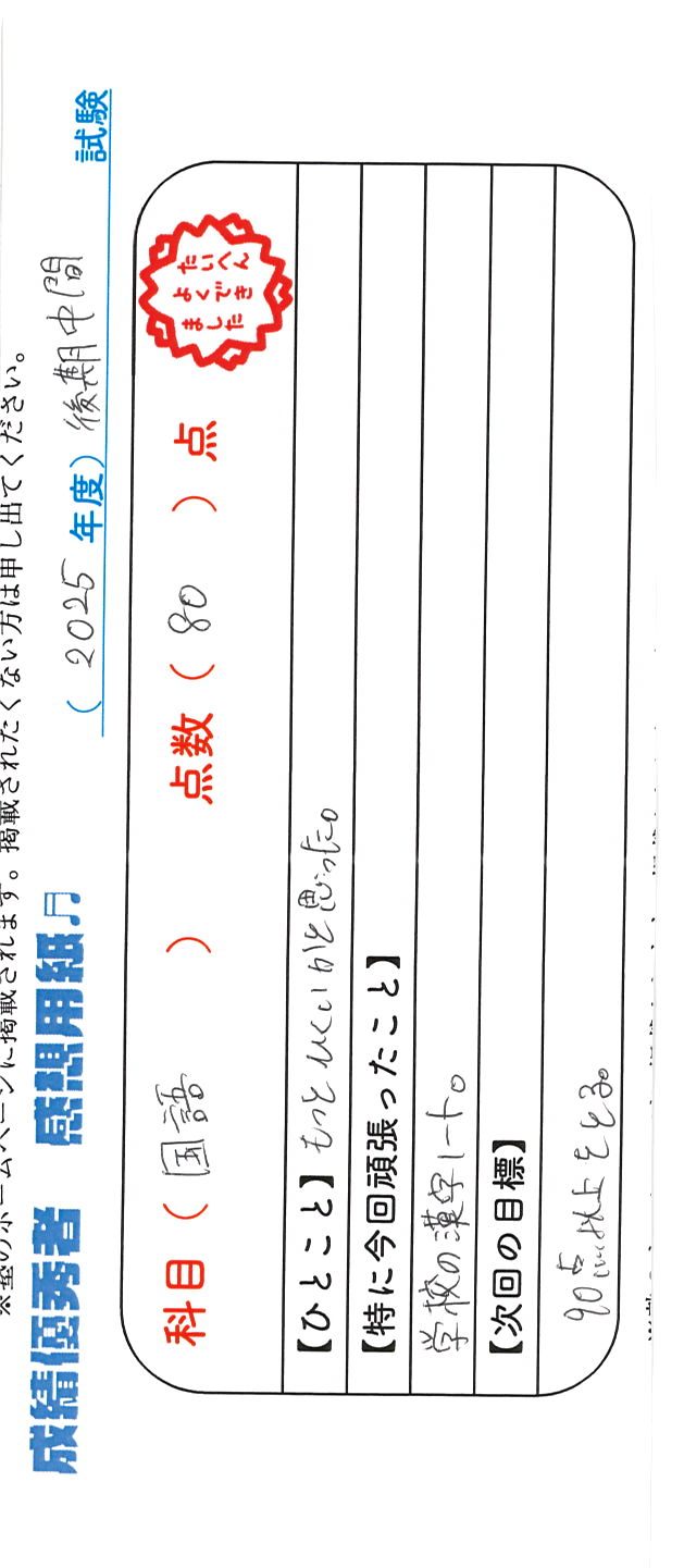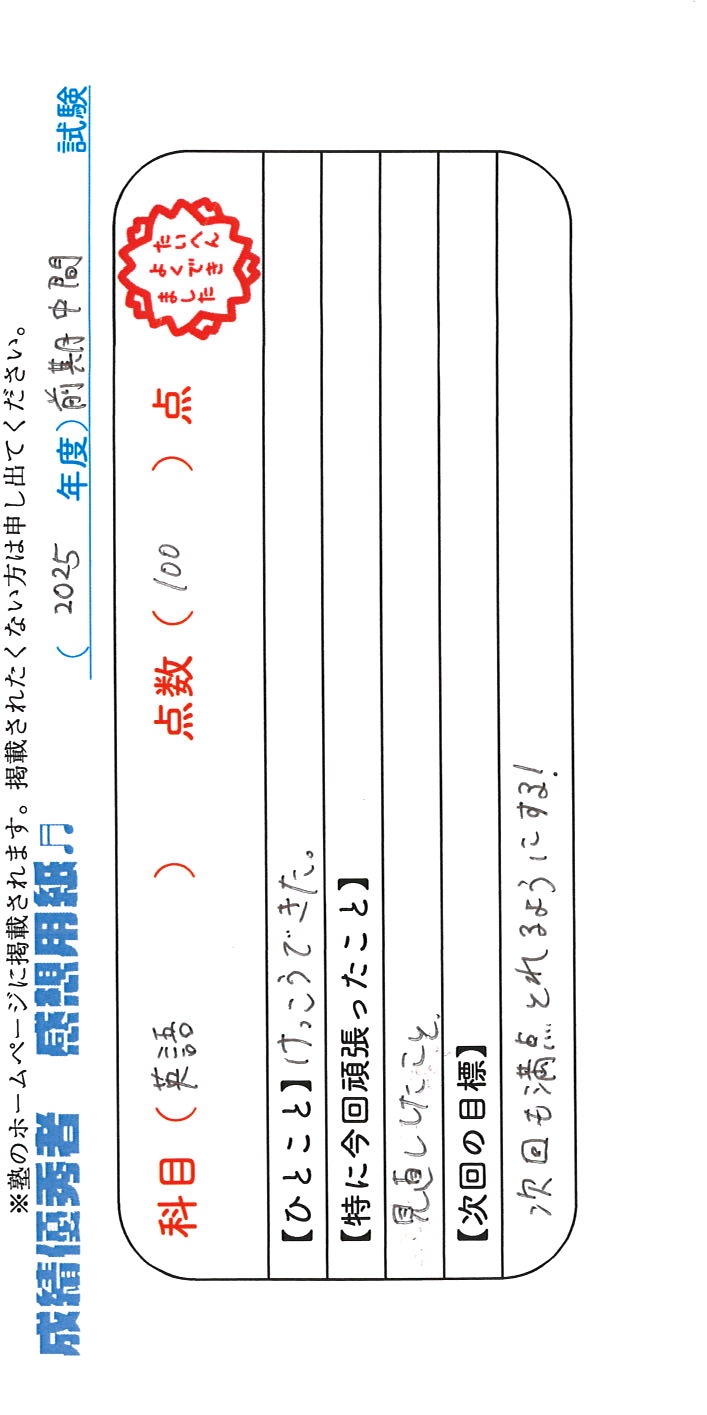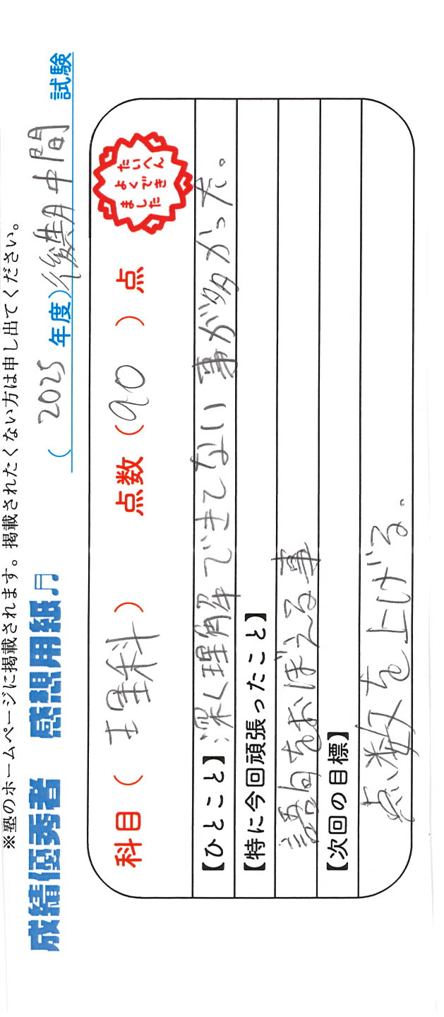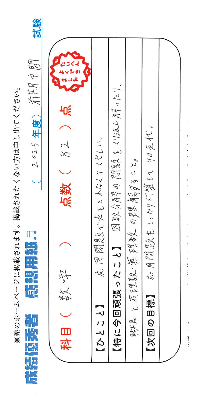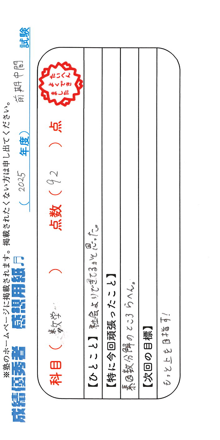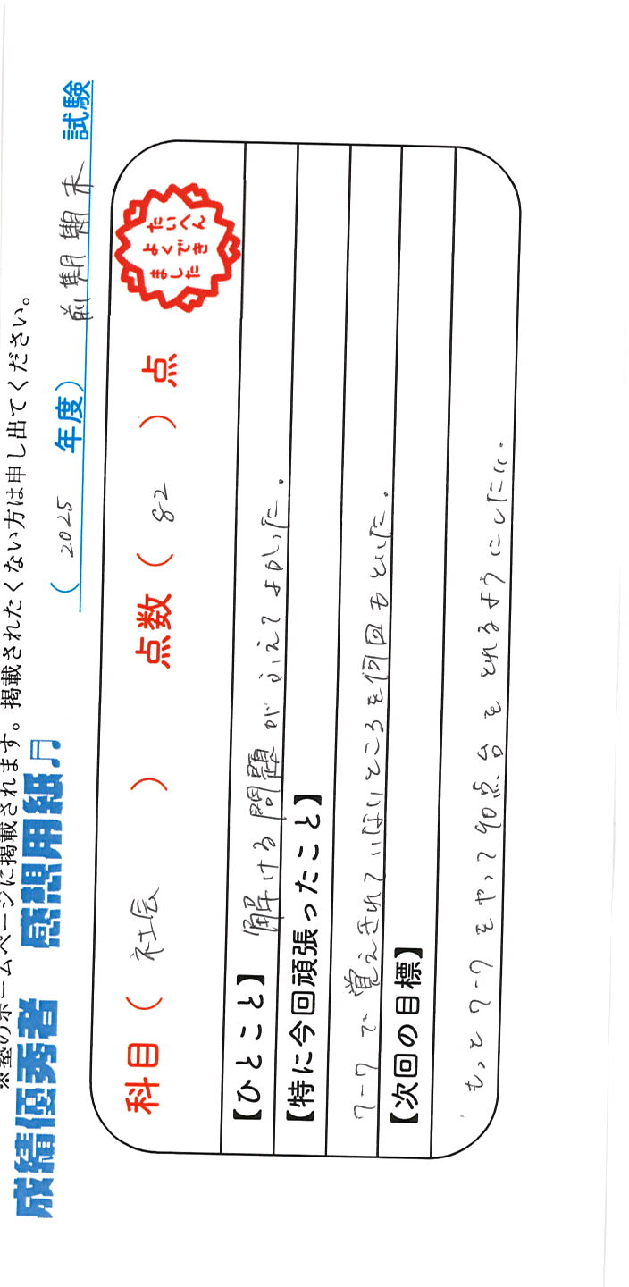 定期試験で優秀な成績を取った生徒さんのメッセージです。