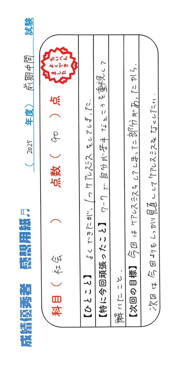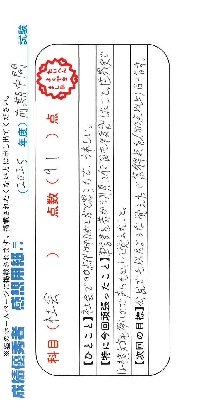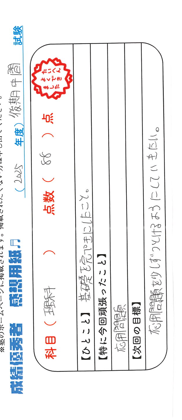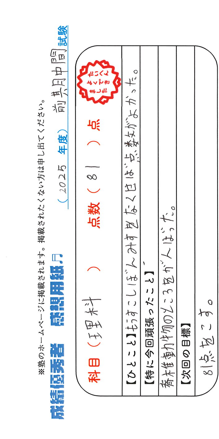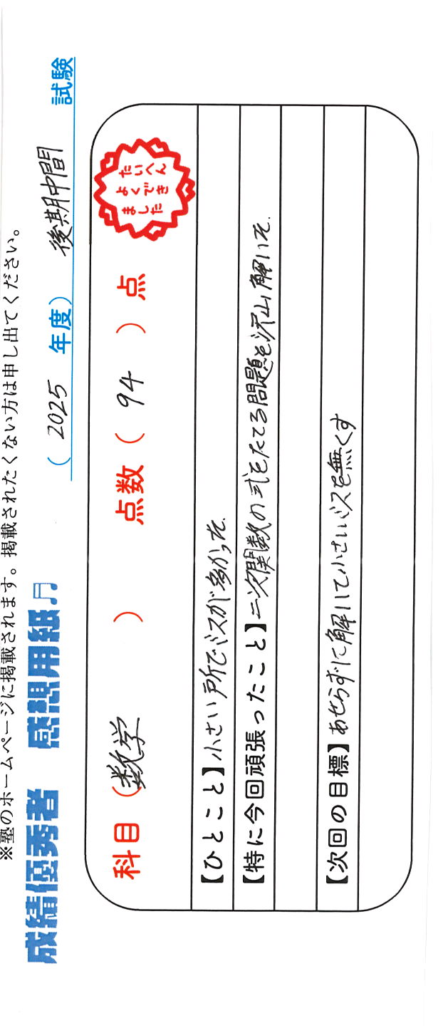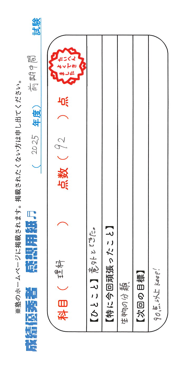 定期試験で優秀な成績を取った生徒さんのメッセージです。